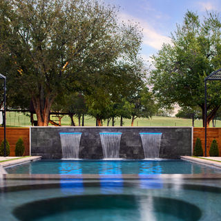 This straight line pool was part of a massive home remodel for the customer. Before we began construction, a very small vinyl liner pool sat in the place of the new garage. The home itself was going to transition from a rustic style home to a contemporary painted white home so the pool needed to reflect the change to the home. The site line out of the house focuses on a beautiful oversized infinity spa which hides the view of the sunken kitchen area. The raised back wall with LED sheer descents brings the whole courtyard pool together between the new garage and new wing of the house.